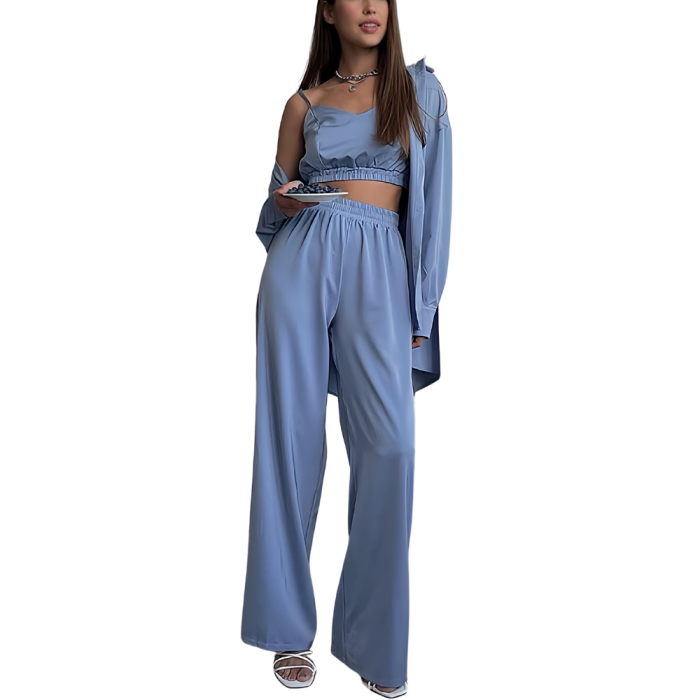 Ενδυθείτε με την απαλή αγκαλιά αυτού του ουρανί-μπλε σετ πιτζάμας 3 τμχ AMANI, με σατέν υφή σχεδιασμένο να κολακεύει τη σιλουέτα σας με το λεπτεπίλεπτο τοπ τύπου καμισόλα-μπουστάκι με λάστιχο στο τελείωμα και πλατιά V λαιμόκοψη. Συνοδεύεται με την αέρινη ψηλόμεση παντελόνα σε φαρδιά γραμμή και την ασορτί μακρυμάνικη oversized πουκαμίσα. Ιδανικό για χαλάρωση με στυλ, είναι μία ονειρική προσθήκη στη νυχτερινή σας ρουτίνα.