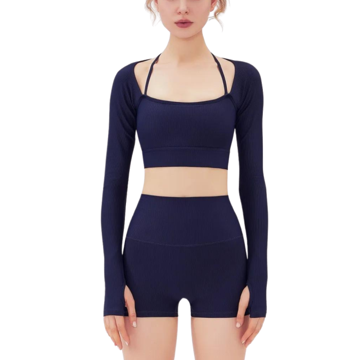 - Μακρυμάνικο κροπ αθλητικό ριμπ μπλουζάκι με ανοιχτό ντεκολτέ, με τρύπα αντίχειρα στο μανίκι και ενσωματωμένες τιράντες στο μπούστο για να κάνεις την αγαπημένη σου άσκηση με στυλ και άνεση