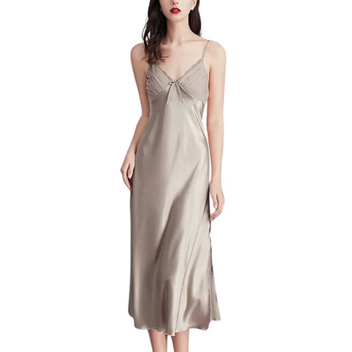 - Μάξι σατέν νυχτικό με λαιμόκοψη V στο ντεκολτέ και σούρες στο μπούστο με φιογκάκι για στυλ και άφθονη αίσθηση απαλότητας στην επιδερμίδα σου