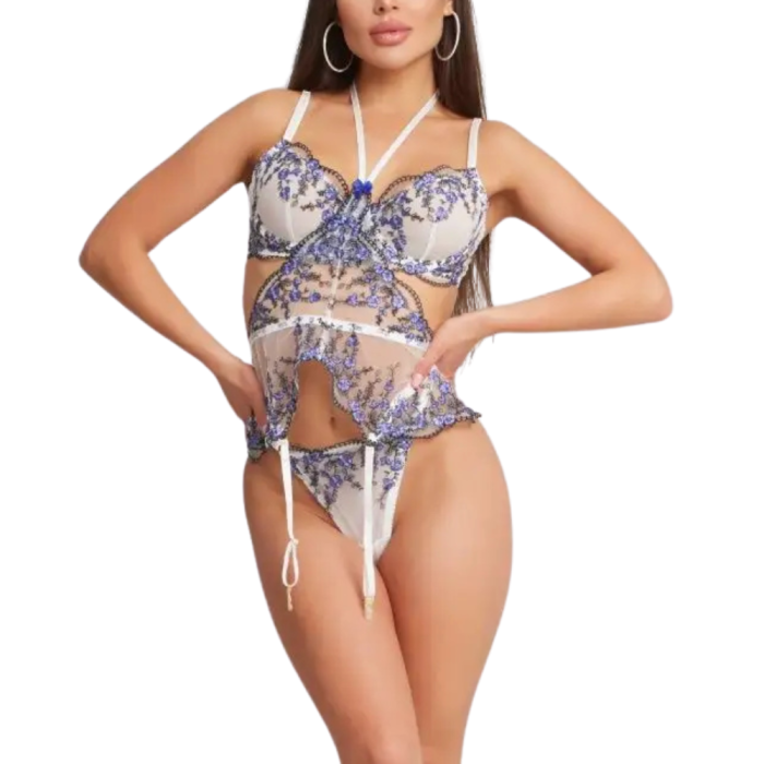 ANTHEA Κεντητό σετ εσωρούχων με μπανέλα, μπλε λουλούδια και διαφάνεια