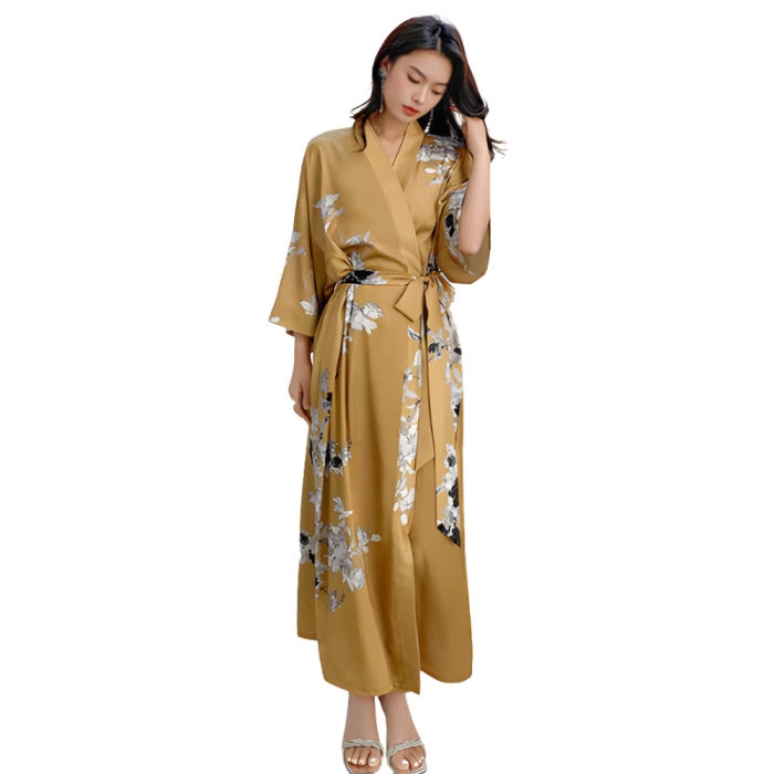 Η ρόμπα BALI με το μακρύ μήκος που διαθέτει θα σε καλύπτει ως τις άκρες και την σατέν της υφή που θα σε αγγίζει με απαλότητα δεν θα θες να μην την κάνεις δική σου! Διαθέτει ζώνη για εύκολο δέσιμο γύρω από τη μέση, φαρδύ μακρύ μανίκι και κινέζικο φλοράλ μοτίβο σε μουσταρδί χρώμα που θα γοητεύσει!