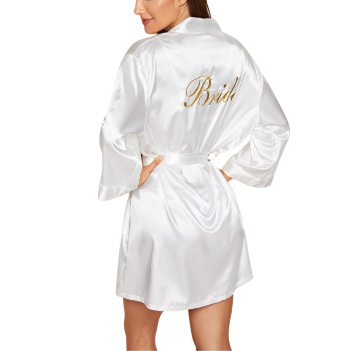 - Μακρυμάνικη ρόμπα με σατέν υφή και bride κεντητό λογότυπο στην πλάτη με ζώνη που δένει στη μέση για να σου χαρίσει στυλ και την κάλυψη που χρειάζεσαι την πιο ευτυχισμένη μέρα της ζωής σου