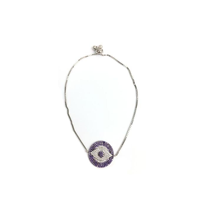 Είναι ένα φίνο γυναικείο κόσμημα κατασκευασμένο από ασήμι 925 επενδεδυμένο με ζιργκόν πετράδια σε μωβ και ασημί χρώμα σε σχέδιο ματάκι. Φέρει μοντέρνο ρυθμιζόμενο λουράκι για ασφάλεια και σωστή εφαρμογή, ενώ διαθέτει και μια εξαιρετικά φίνα συσκευασία.