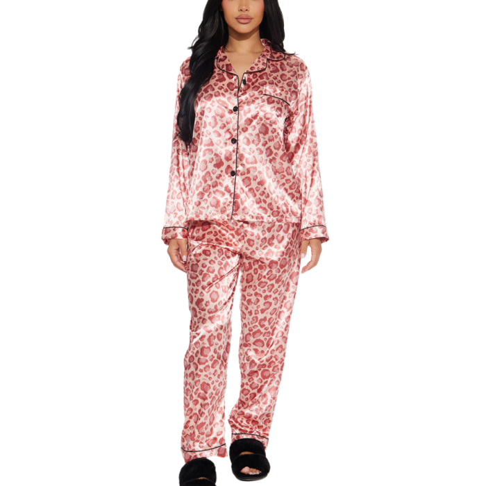 Το πιτζάμα πάρτυ της χρονιάς είναι εδώ και θα μείνει αξέχαστο μόνο με το σετ πιτζάμας 4 τεμαχίων GEMMA με ροζ λεοπάρ σχέδιο, μακρυμάνικη σατέν υφής πουκαμίσα, ασορτί παντελόνα με ψηλόμεση εφαρμογή και φυσικά μια μάσκα ύπνου για να μην αποσπάται ο ύπνος σου από το χώρο γύρω σου μαζί με ένα πουγκάκι για να αποθηκεύεις τα λαστιχάκια των μαλλιών σου ή ό,τι άλλο εσύ επιθυμείς!