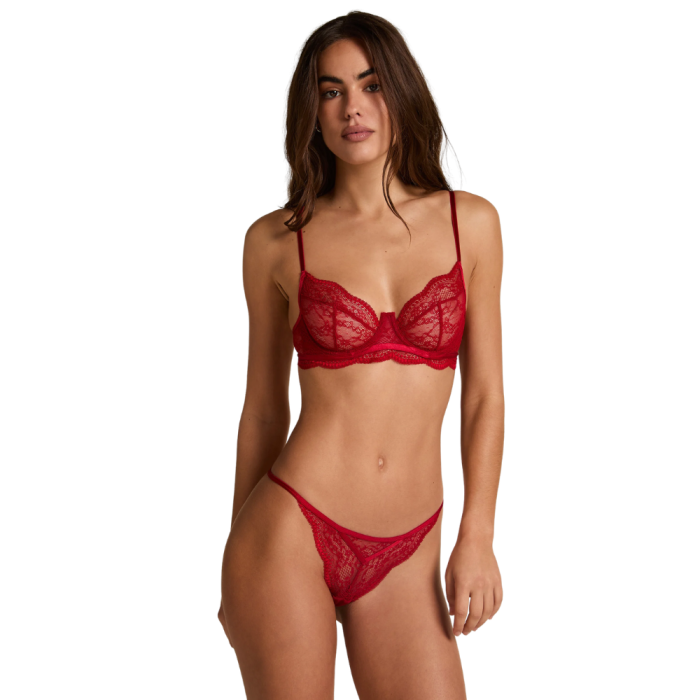 Το ISABELLE είναι ένα εκλεπτυσμένο δαντελένιο σετ εσωρούχων που αναδεικνύει τη θηλυκότητα με ένταση και κομψότητα. Το ημιδιάφανο σουτιέν αγκαλιάζει φυσικά το στήθος, ενώ η λεπτή δαντέλα δημιουργεί ένα ρομαντικό και ταυτόχρονα δυναμικό αποτέλεσμα. Το ασορτί στινγκ ακολουθεί τη γραμμή του σώματος, προσφέροντας ανάλαφρη εφαρμογή και αισθησιακή ισορροπία. Διατίθεται σε κόκκινο για έντονη, παθιασμένη διάθεση και σε μαύρο για διαχρονική, μυστηριώδη κομψότητα.