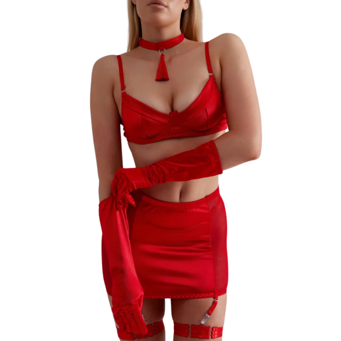 - Πολυτελές κόκκινο σετ με 6 κομμάτια: σουτιέν, φούστα, ζαρτιέρες, choker, καλτσοδέτες και στρίνγκ