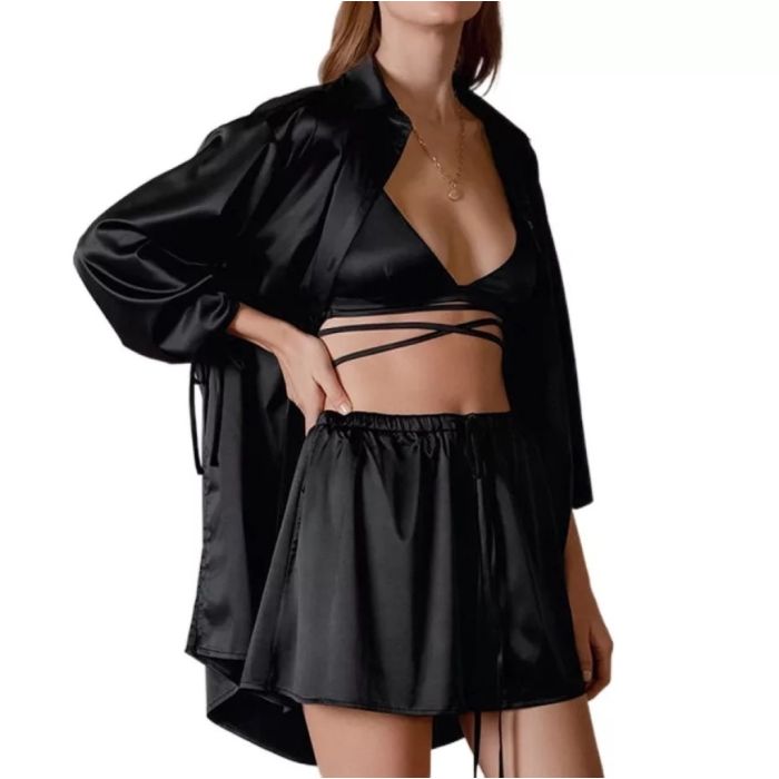 Περιγραφή / KENNA Σατέν σετ πιτζάμες με τριγωνάκι μπράλετ με κορδόνια στη μέση, αέρινο σορτσάκι & υπερμεγέθη μακρυμάνικη πουκαμίσα