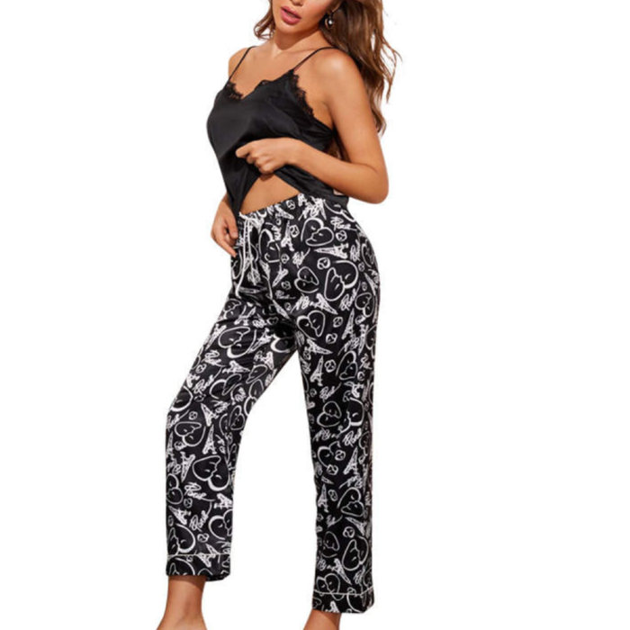Απόλαυσε τους πιο χαλαρούς μεταξένιους ύπνους με το σετ σατέν υφής πιτζάμας LANA με τοπάκι με τριγωνικό ντεκολτέ και λεπτομέρεια δαντέλας σε μαύρο χρώμα και ασορτί μακρύ παντελόνι με λάστιχο και κορδονάκι στη μέση με αφηρημένα λευκά και μαύρα σχέδια