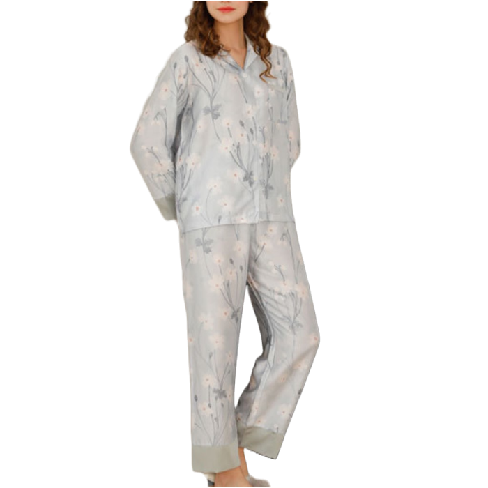 LIVIA Σετ πιτζάμες με αχνά λευκά λουλούδια, μακρυμάνικη πουκαμίσα και παντελόνα 100% βισκόζη