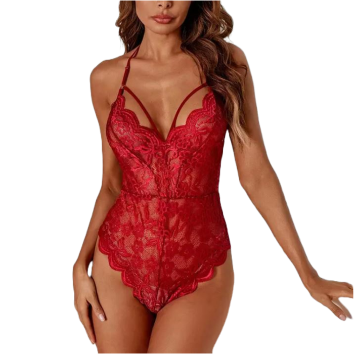 - Ολόσωμο κορμάκι από δαντέλα με στραπς στο στήθος και κυματιστά τελειώματα για να προσθέσει φινέτσα στην εμφάνιση