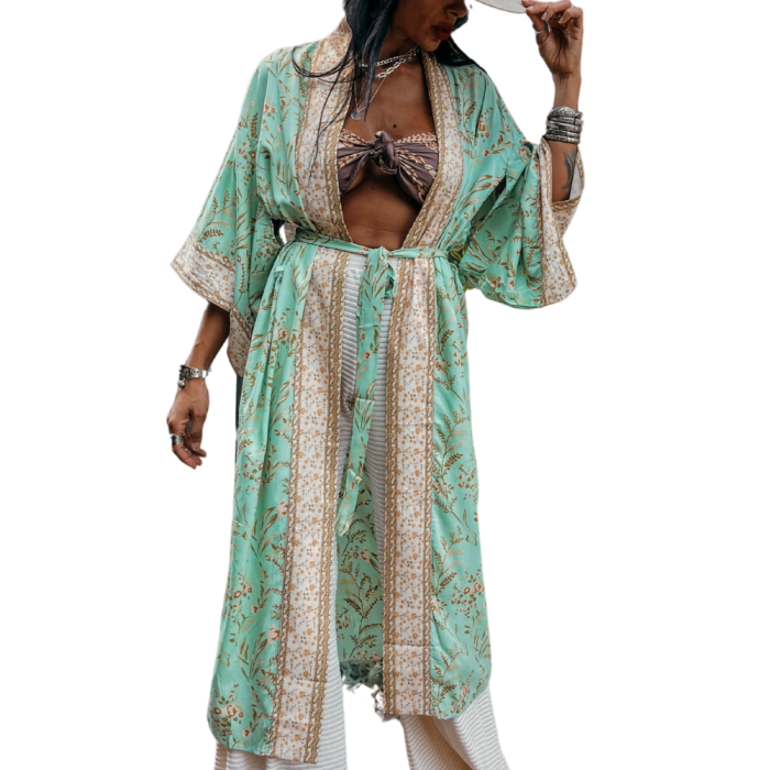 Το MINT BLOOM είναι ένα ονειρικό κιμονό παραλίας που αποπνέει ρομαντισμό και καλοκαιρινή ανεμελιά. Η απόχρωση της μέντας συνδυάζεται τέλεια με τα λεπτά ροζ τελειώματα και το λουλουδάτο μοτίβο, δημιουργώντας ένα κομψό αποτέλεσμα που θυμίζει ηλιοβασίλεμα σε νησί.