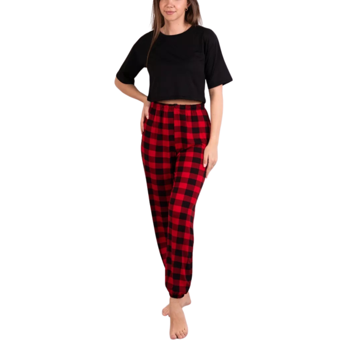- Σετ Δύο Τεμαχίων: Περιλαμβάνει μαύρο κοντό μπλουζάκι με χαλαρή εφαρμογή και ασορτί καρό παντελόνι.