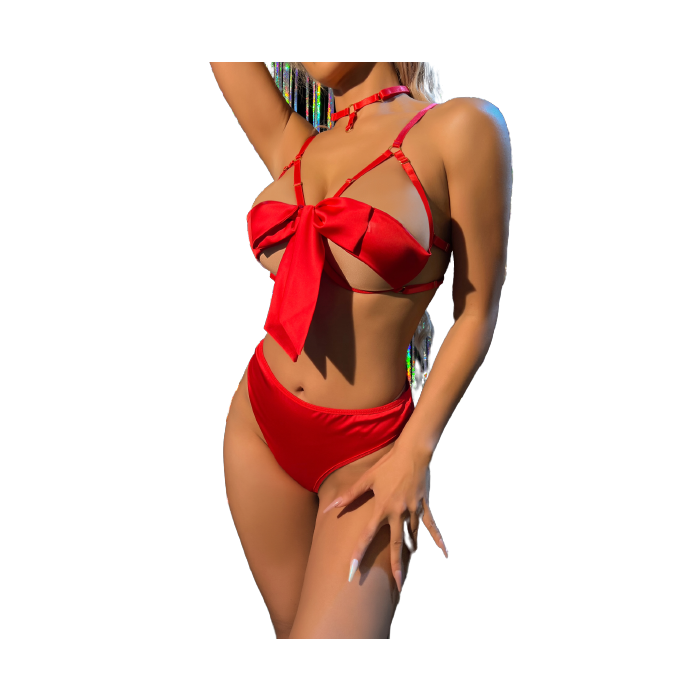 NANTIA Αποκαλυπτικό κόκκινο σατέν υφής σετ αισθησιακών εσωρούχων με φιόγκο, μπανέλα και δεσίματα