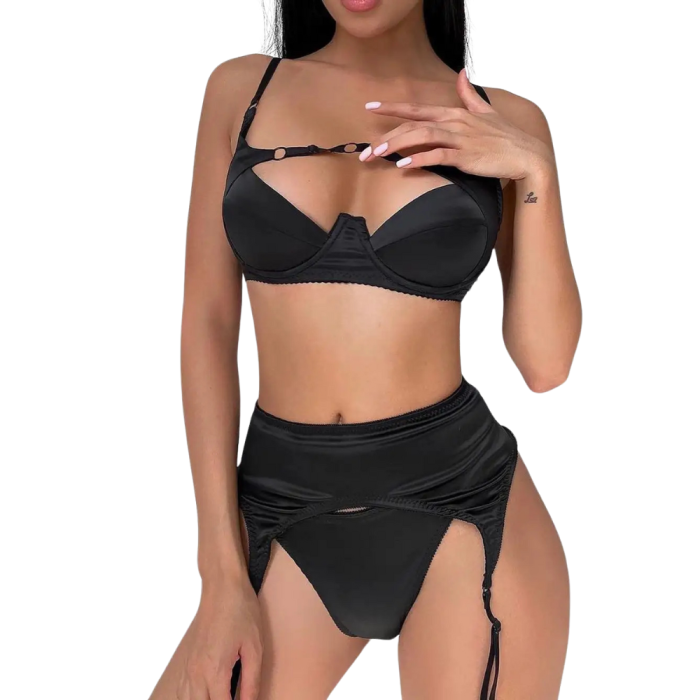 Ανακαλύψτε τη διαχρονική γοητεία του μαύρου με το σετ εσωρούχων NEFELI. Αυτό το κομψό σετ 3 τεμαχίων περιλαμβάνει σουτιέν με μπανέλα και ιδιαίτερες λεπτομέρειες με κρίκους, ψηλόμεσο μπραζιλ εσώρουχο και ασορτί ζαρτιέρα. Ο σχεδιασμός αγκαλιάζει τις καμπύλες με πολυτελή σατέν υφή, συνδυάζοντας δομή και αισθησιασμό.