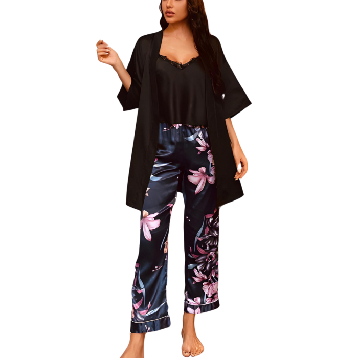 Περιγραφή / NINA Σετ πιτζάμες 3 τμχ σατέν υφής με V τοπ με δαντέλα, φλοράλ παντελόνα & ρόμπα με μανίκι 3/4