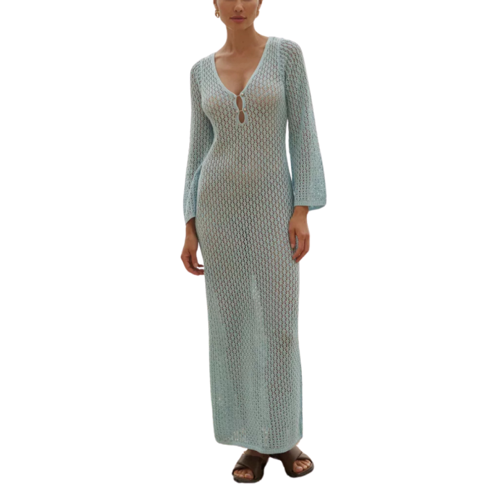 Περιγραφή / OCEAN BREEZE Μακρύ πλεκτό φόρεμα παραλίας σε γαλάζιο με κουμπιά
