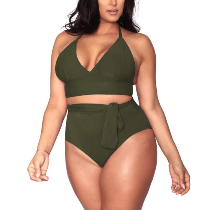 OLIVE POWER Plus size μπικίνι σε χακί και μαύρη απόχρωση με βαθύ V και ψηλόμεσο κάτω μέρος με ζώνη