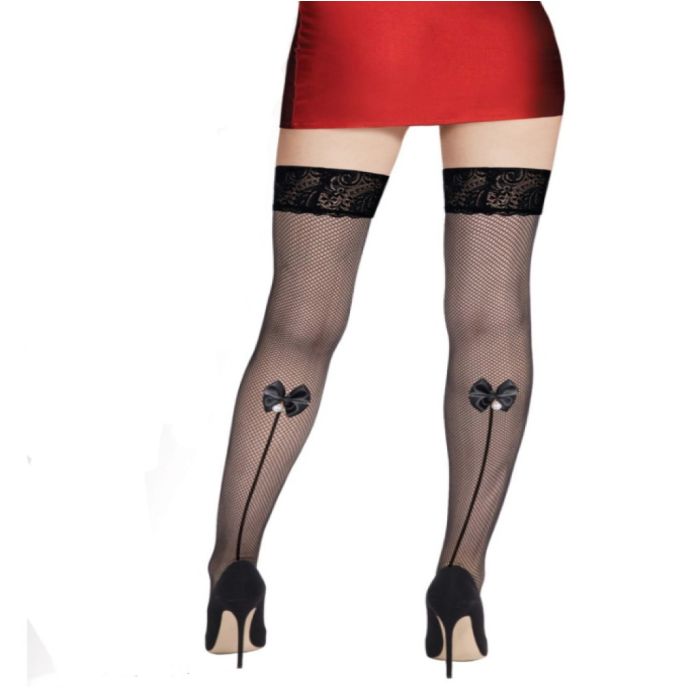 Ψηλές κάλτσες Over the Knee μαύρο δίχτυ, με λεπτομέρεια γραμμής που στο τελειωμά του έχει φιόγκο και πέρλα.