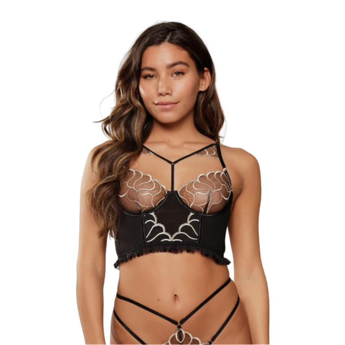 Το μπραλέτ RANIA είναι ένα εντυπωσιακό κομμάτι εμπνευσμένο από τη δομή του κορσέ, σχεδιασμένο για να αναδεικνύει τη θηλυκή σιλουέτα με κομψότητα και τόλμη. Οι διαφανείς επιφάνειες με καλλιτεχνικά μοτίβα προσθέτουν αισθησιακό χαρακτήρα, ενώ οι χρυσές λεπτομέρειες δίνουν μια πολυτελή πινελιά. Το σχέδιο αγκαλιάζει το σώμα με σταθερότητα και στυλ, καθιστώντας το ιδανικό τόσο για lingerie εμφανίσεις όσο και για βραδυνές εξόδους.