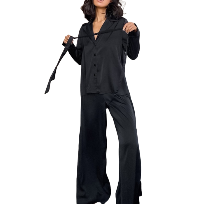 ROMINA Σατέν υφής σετ πιτζάμες με πουκαμίσα με δέσιμο στα μανίκια & παντελόνα με ανοίγματα στο πλάι