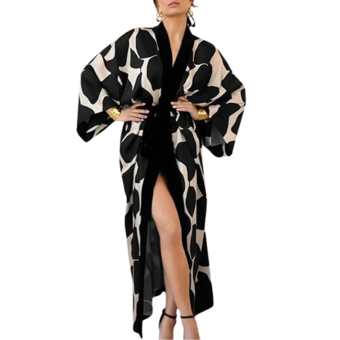ROXANY Μακριά ρόμπα με μεγάλο γεωμετρικό ασπρόμαυρο σχέδιο, φαρδύ μανίκι και ζώνη που δένει στη μέση