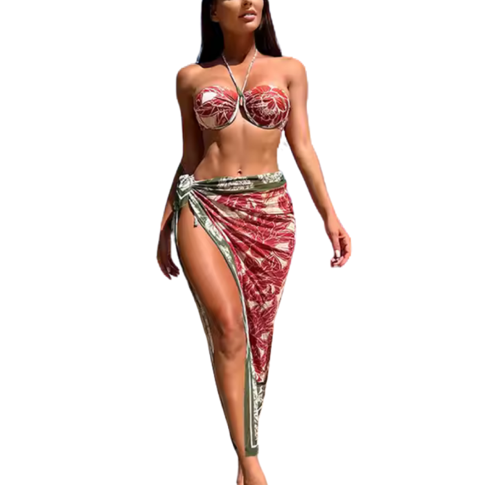 SAVANNA Μαγιό 3 τεμαχίων με μπανέλα, τύπωμα τροπικών φύλλων και παρεό με δέσιμο στο πλάι