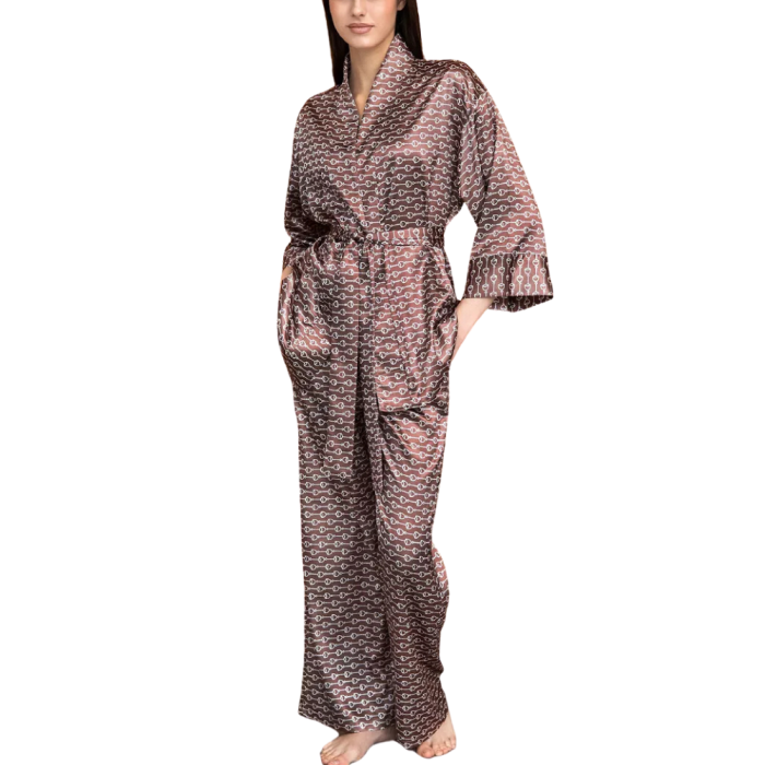 Περιγραφή / VERA Σετ πιτζάμες με αέρινο κιμονό με ζώνη και παντελόνα με σχέδιο αλυσίδας